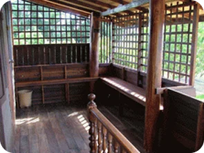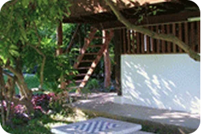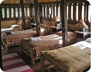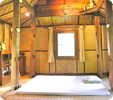 We offer 5 traditional dwelling houses arranged as in a rural Thai village around a pond. There are 11 bedrooms plus a dorm, all of which have windows without glass, overhanging roofs, wooden shutters to close during the Monsoon thunder storms, and shaded porches. The houses are all old farmhouses on stilts but each one has hot showers and modern toilets down a short flight of stairs. There are also open social areas downstairs with mats, tables, chairs and, of course, the traditional settees for lounging. In addition there is a small kitchen for you to make tea and coffee—and a fleet of bicycles to take you out in the rice.
