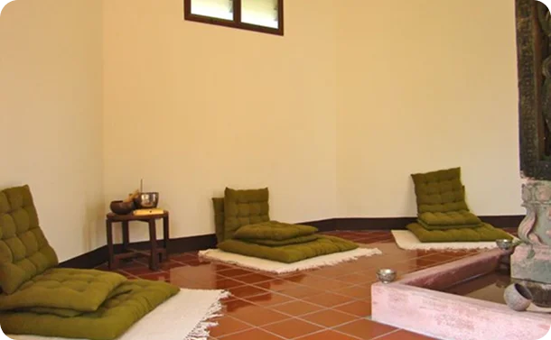 There are no specifically religious images inside the space, just a fountain with moss and ferns as green as the cushions against the bare white walls. Indeed, all four elements play around you, earth, air, fire and water, and we make it very clear that the space is for anything you feel moved to do in it too — it’s a wonderful place for a chat or a nap, or for reading a book by yourself or singing or playing your dulcimer or your body in yoga. And of course its perfect for Vipassana, or any other mediation for that matter — and needless to say, you meditators do get priority, don’t worry!