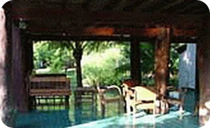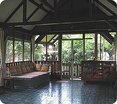 Baan Jung Kaew is our oldest building. It used to be our only accommodation with a hot water shower and toilet directly attached to a bedroom, and still has the largest and most private of all our porches extending right out over the pond. A joy for a couple, it’s also sometimes chosen by close friends who like to talk all night. There is a double and a single bed, and it’s a pleasure for a family. Couples always have priority for it, needless to say, but if we have room it can even be booked by a single person at no extra charge.