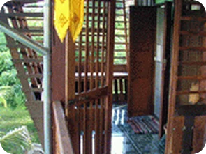 Our largest building, Baan Uii Kham has a red tiled ground floor with three toilets, three hot water showers, and lots of tables and chairs. The Baan Hom Samunphrai office is also located here. There are 3 staircases leading up to 3 separate porches, each of which connects to two rooms, 1 with a double bed and the other with a single.