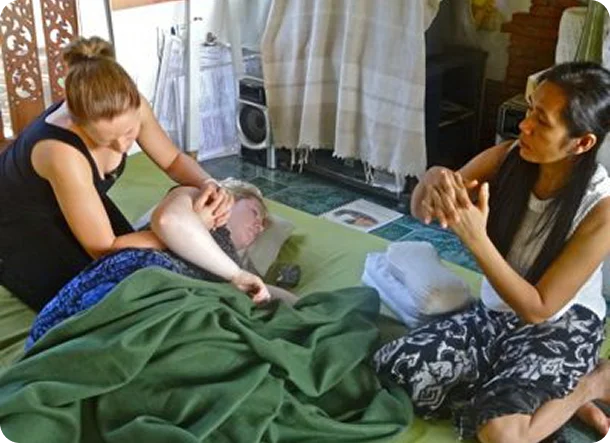 Having looked at these photos you might like to compare the mood and body language you see in Homprang’s western students above with the photos of her Thai students working with her at a much larger class in town. Click Here, and I think you’ll agree that Homprang manages to create the same sense of ease, pleasure and well-being in both worlds.