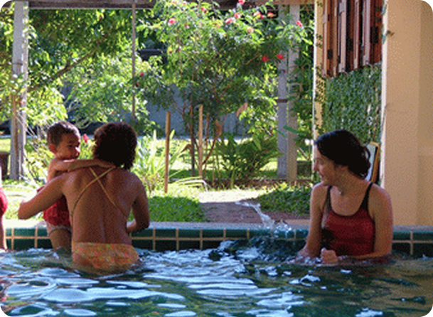 Cleanse the body above all, the toxins pouring out in the sweat. But they also enter into the body through the pores, particularly in the scalp, feeding the skin, freshening the blood, opening up the nasal passages and lungs, and last but by no means least, dispelling our gloom. Finally, our steam baths are always accompanied by fresh ginger tea, a delicate stimulant and restorative. Indeed, the whole quality of life is improved by the herbal steam bath experience, and good talk and friendship are always right there beside the Baan Hom pool.