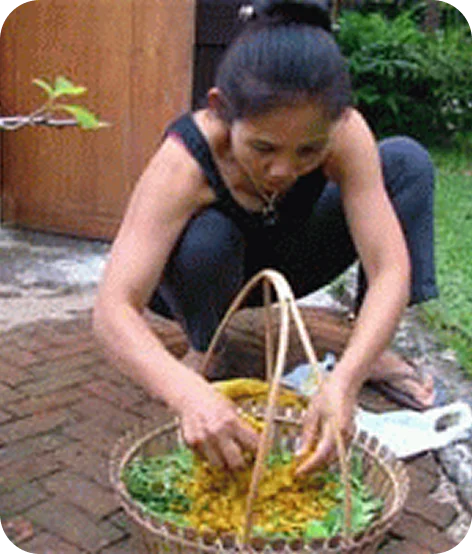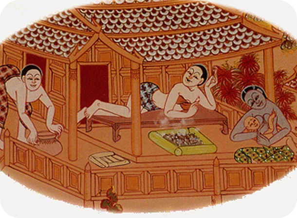 The healing properties of steam heavy with the natural essences present in its medicinal plants has long been known in Thailand. New mothers spend at least a month after childbirth in a herbal steam bath tent with their babies close beside them, and the whole family sits in the evening by the cooking fire not only to escape the mosquitoes but to benefit from the medicinal fragrances of the herbs in the cooking and the aromatic wood on the fire. Herbal extracts are also rubbed into the body with hot, fist-sized compresses, and poultices are wrapped around bites, wounds, and sprains. The external application of herbs through heat and steam is a very important aspect of Thai traditional preventive medicine as well, and the sense of well-being among Thai country people is partly a result of their ‘folk’ aromatherapy.